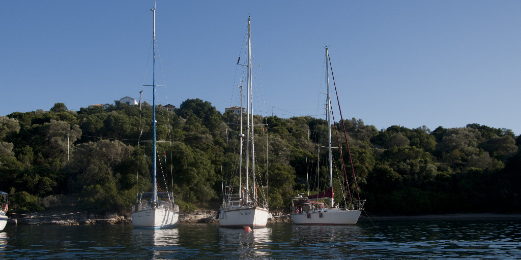 ¿Por qué esta cala y no cualquier otra? No hay ninguna razón de peso, tan solo que la primera vez que llegamos a estas aguas y horrorizados por el gentío, las aguas sucias y las malas pulgas de los vecinos en Bicho, donde habíamos quedado con el Alea, encontramos una cala casi solitaria, con una rustica tasca y un pequeño muelle para atar la auxiliar, aguas en las que veíamos el ancla clavada a mas de doce metros y donde puedes escoger entre fondear a la gira, como hacíamos al principio de nuestro aprendizaje o con lineas largas por popa como hacemos ahora, ya con mas experiencia.