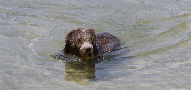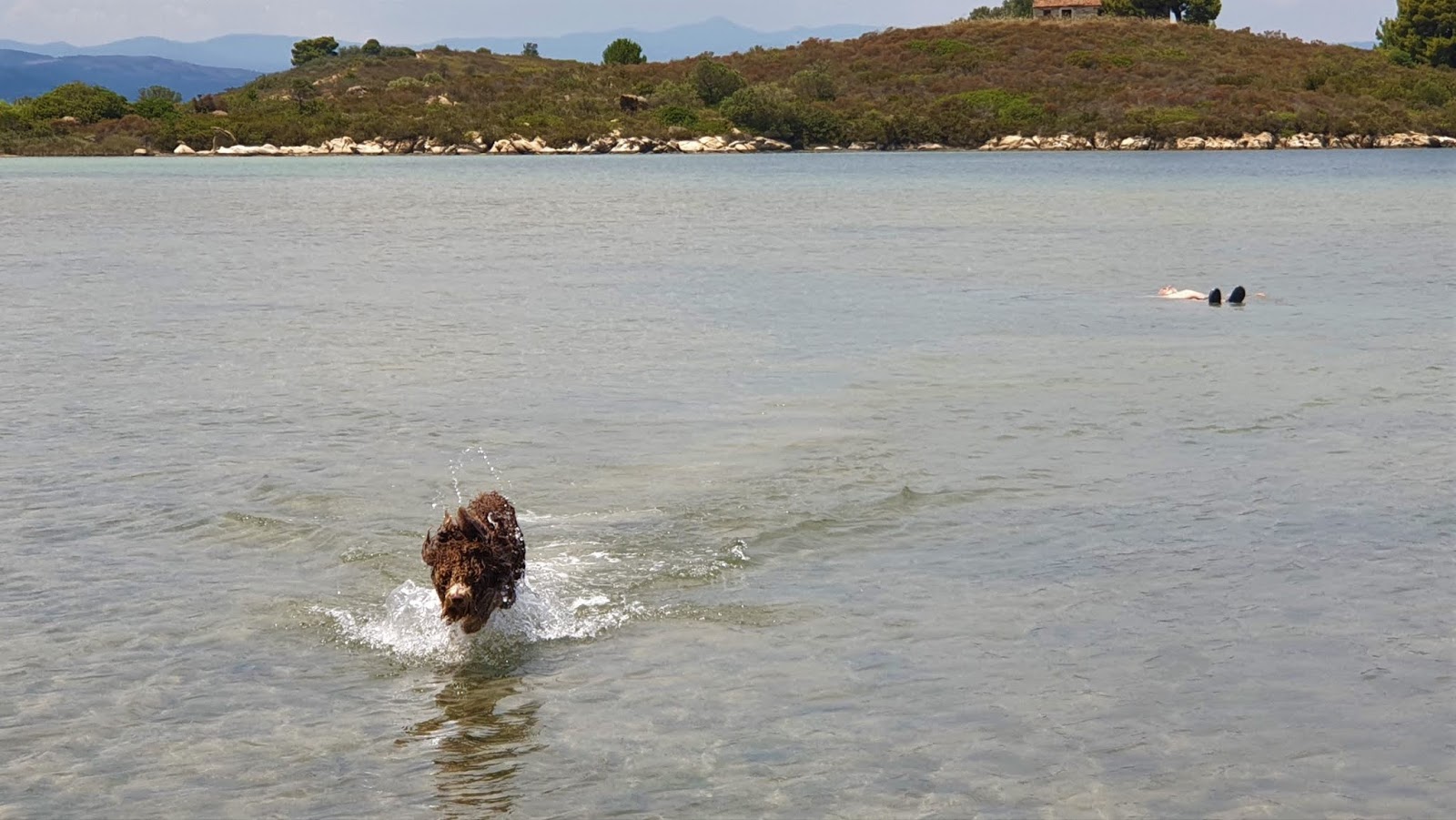 Lo cierto es que le cuesta saltar la primera vez, y va un poco inquieto, hasta que llegamos a la playa, su pasión, entones salta , corre, se baña, se reboza en la arena y... trata de morderle los pies a todo el que se le cruza en su camino, manía que no sabemos como quitarle. Se pone delante, gruñe, se tumba, ladra y salta hacia delante intentando mordisquear los zapatos o sandalias. El problema está en que no a todo el mundo le gustan las "monerias" de un cachorro por muy bonito que sea y además cuando muerde no sabe controlar la medida de su "caricia" y puede hacer daño.