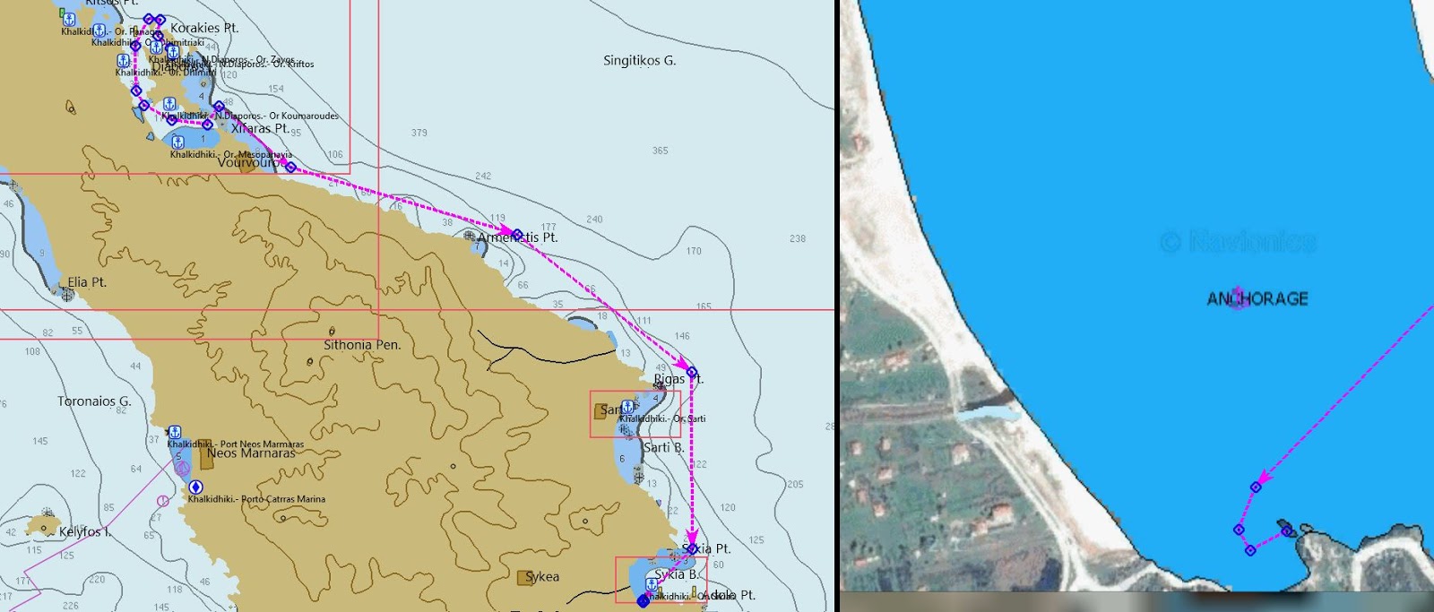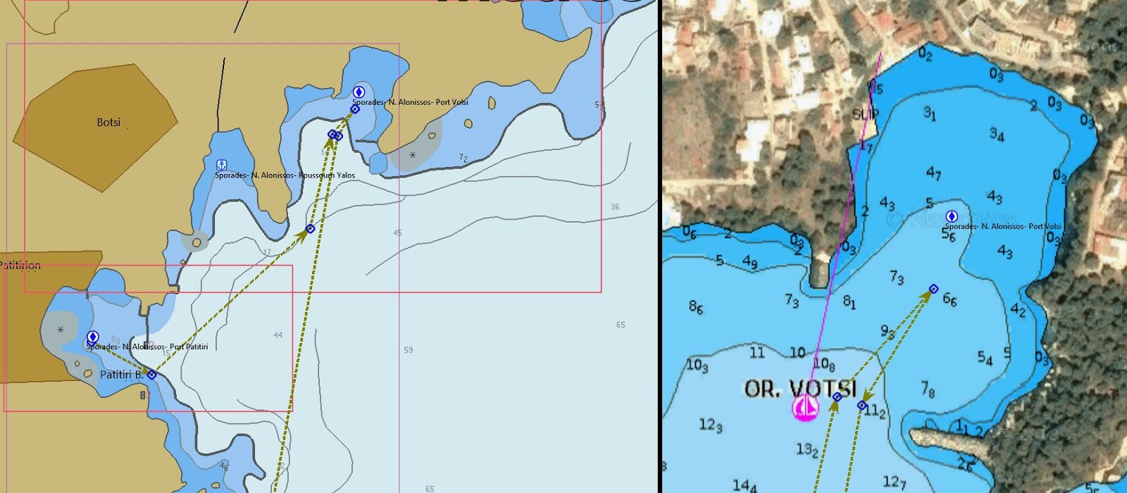 Al día siguiente nos acercamos a Votsi, una cala que es el fondeo alternativo ( y a la desesperada) si falla Kititiri. Han ampliado el espigón que cierra al oeste y está plagado de boyas, lo que me hace temer que sea bastante problemático también aquí el fondeo, salvo dando lineas largas a popa contra las piedras del este.